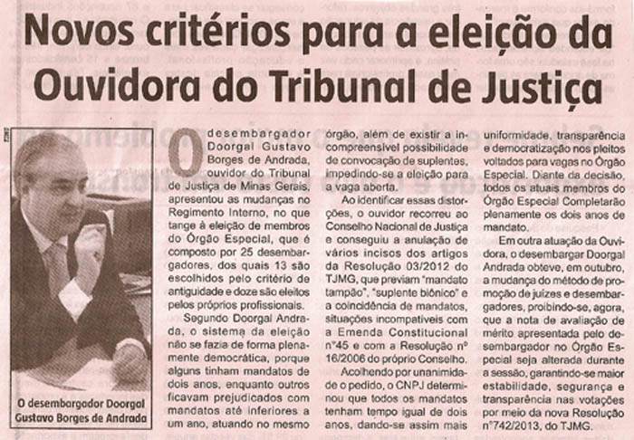O ouvidor do Tribunal de Justiça de Minas Gerais, desembargador Doorgal Andrada, concedeu entrevista ao jornal Edição do Brasil desta semana (24 a 30 de novembro), na qual comenta as mudanças conquistadas na forma como o Tribunal elege os integrantes do Órgão Especial e o modelo de promoção de juízes e desembargadores.
